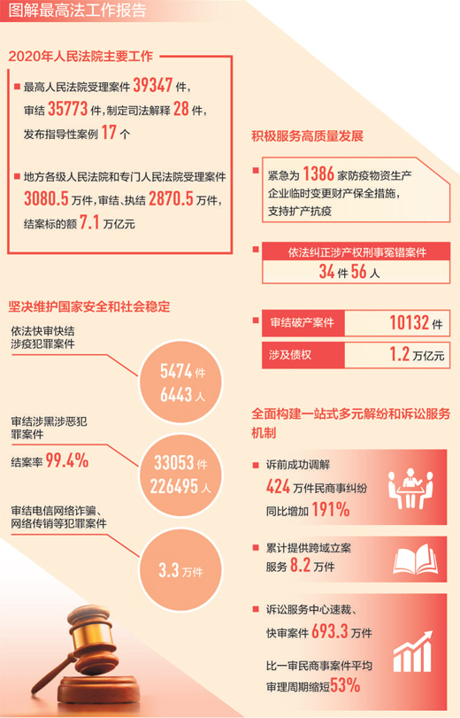 2020年,人民法院堅(jiān)定不移貫徹新發(fā)展理念,緊扣全面建成小康社會(huì)目標(biāo)任務(wù)依法履職盡責(zé),審結(jié)一審民商事案件1330.6萬(wàn)件、行政案件26.6萬(wàn)件,積極服務(wù)構(gòu)建新發(fā)展格局、推動(dòng)高質(zhì)量發(fā)展。