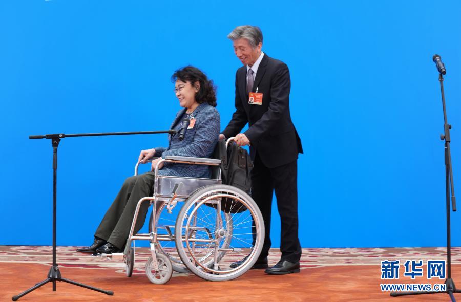3月4日,全國(guó)政協(xié)十三屆四次會(huì)議第一場(chǎng)“委員通道”采訪活動(dòng)在北京人民大會(huì)堂新聞發(fā)布廳舉行。這是采訪活動(dòng)結(jié)束后,全國(guó)政協(xié)委員范迪安推著全國(guó)政協(xié)委員張海迪離開(kāi)會(huì)場(chǎng)。新華社記者 李賀 攝