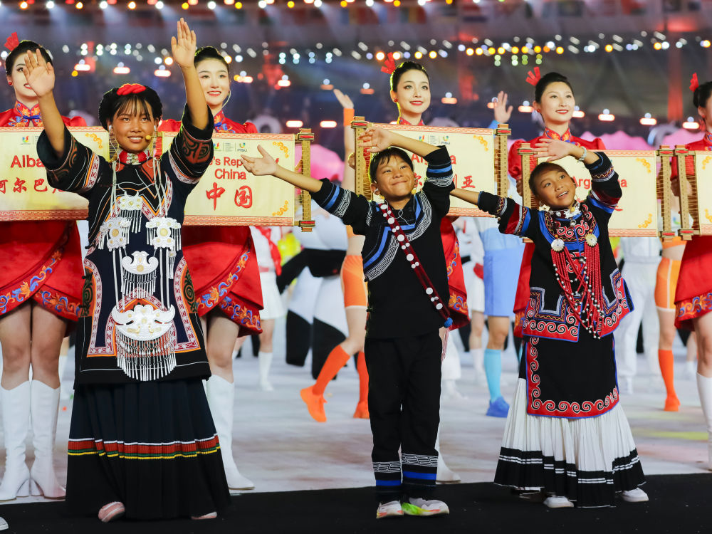 7月28日,來自四川涼山彝族自治州的孩子們在成都大運會開幕式上歌唱。新華社記者 江宏景 攝