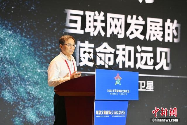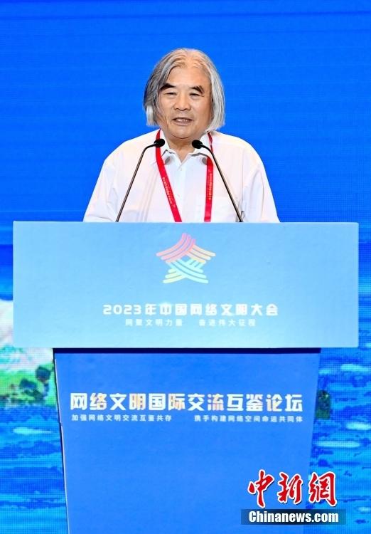 7月18日,2023年中國網(wǎng)絡(luò)文明大會(huì)網(wǎng)絡(luò)文明國際交流互鑒論壇在廈門舉辦。中外嘉賓圍繞加強(qiáng)網(wǎng)絡(luò)文明交流、互鑒、共存等話題展開探討。圖為光明日?qǐng)?bào)社原副總編輯、浙大城市學(xué)院文明與傳播研究院研究員沈衛(wèi)星作主題演講。中新社記者 王東明 攝
