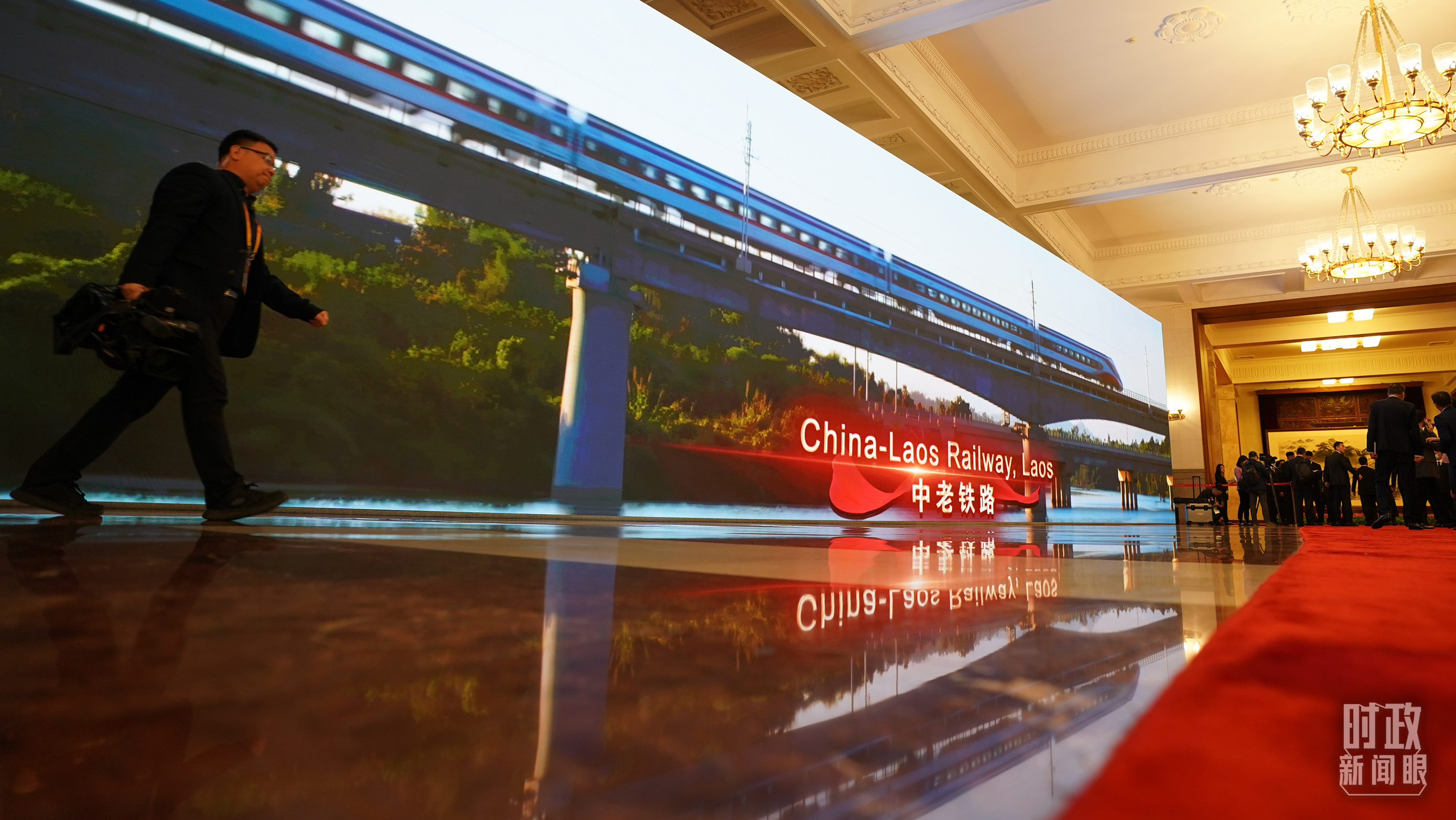 人民大會堂內(nèi)大屏幕展示共建“一帶一路”合作項目。(總臺國廣記者李晉拍攝)