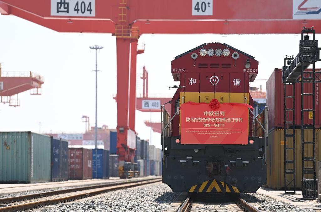 8月3日,中歐班列(西安-塔什干)陜?yōu)踅?jīng)貿(mào)合作隆基綠能光伏組件出口專列在西安國(guó)際港站準(zhǔn)備發(fā)車(chē)。新華社記者 鄒競(jìng)一 攝